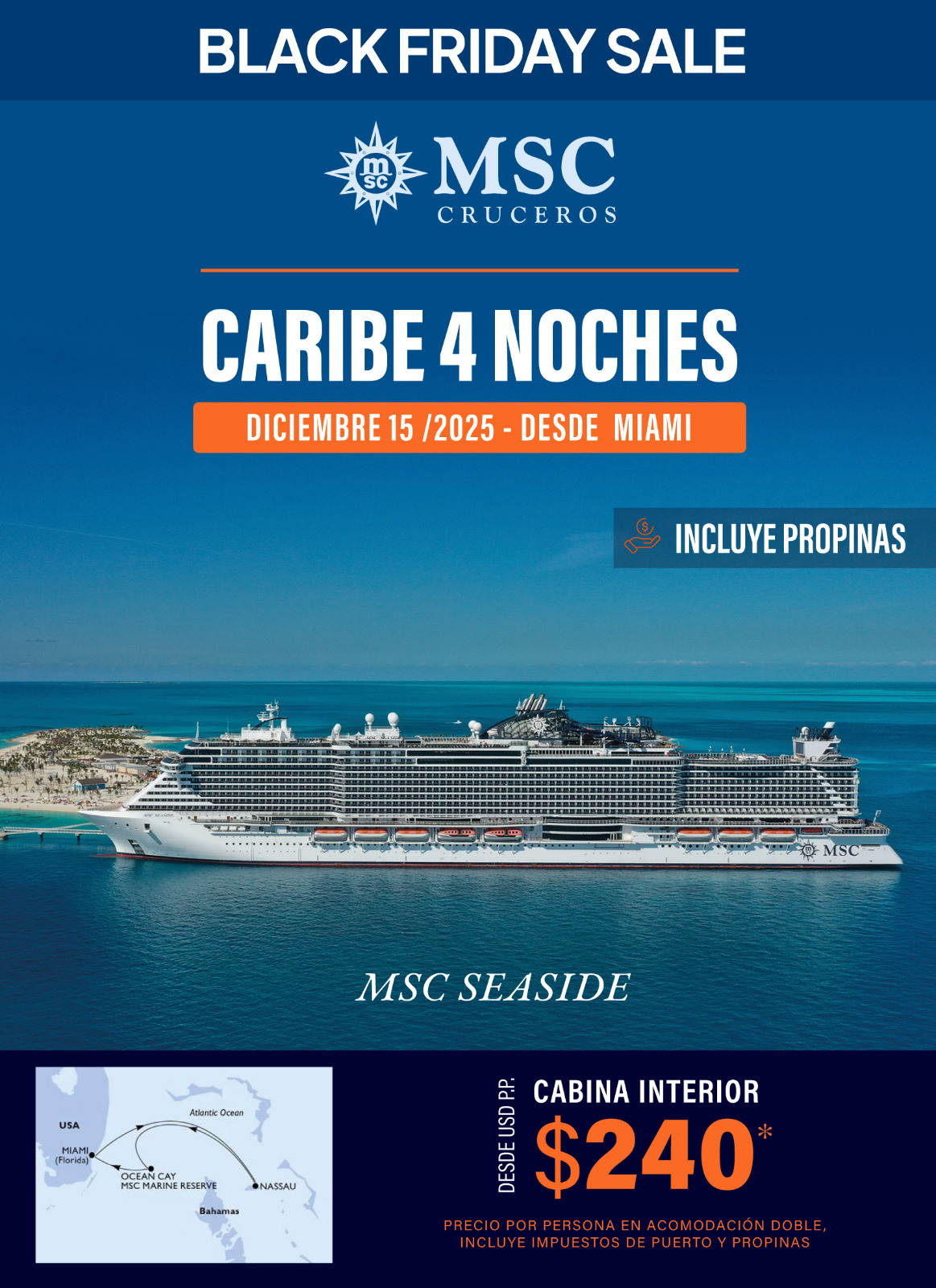 Vive una experiencia única navegando por el Caribe en el MSC Seaside, un crucero moderno y confortable diseñado para disfrutar del mar y destinos espectaculares.