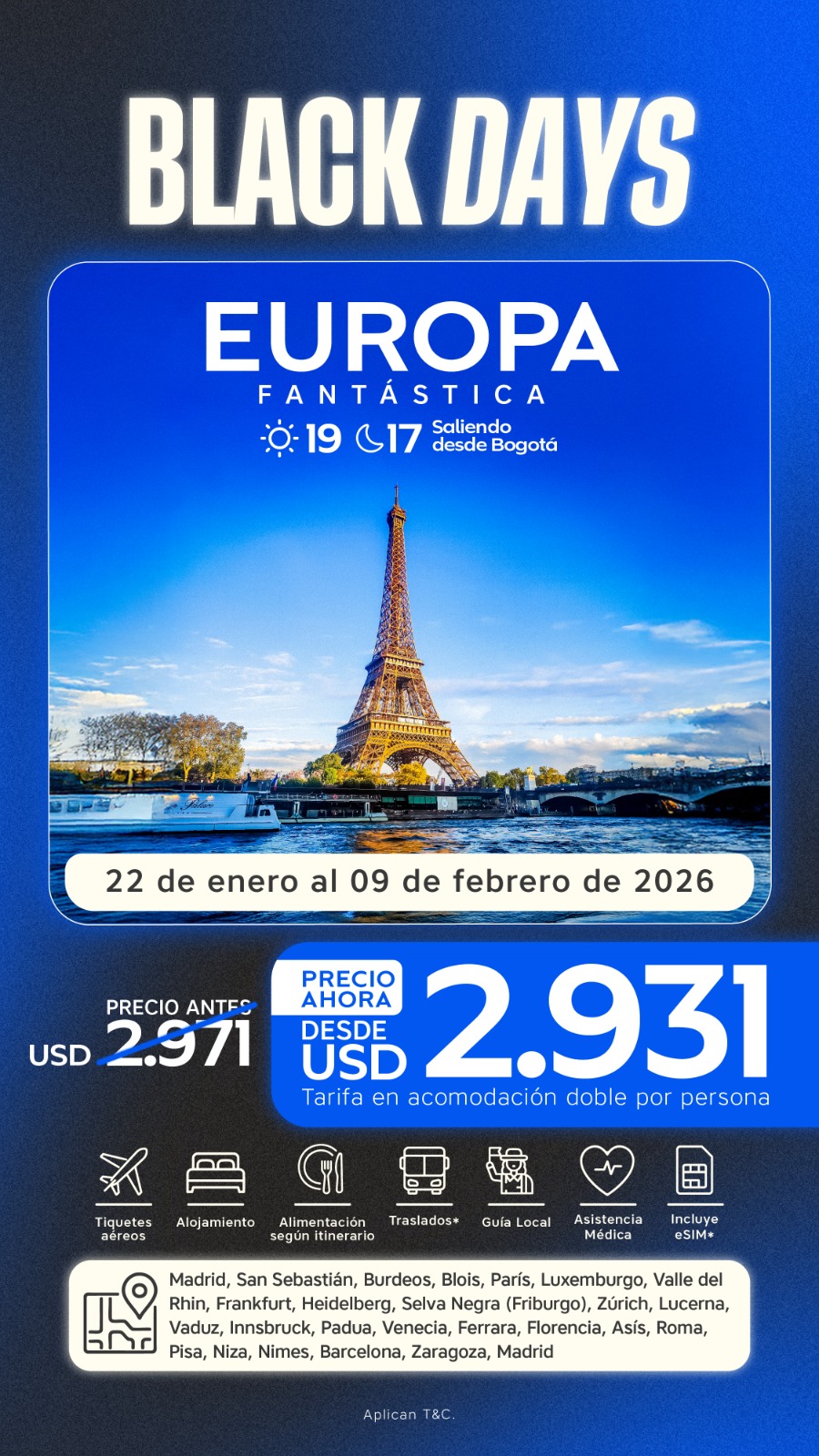 Descubre lo mejor de Europa en un recorrido completo por ciudades icónicas, paisajes históricos y culturas fascinantes, con salida desde Bogotá y servicios incluidos.
